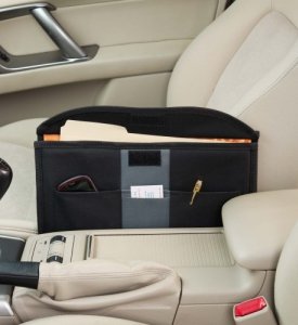 - Fits perfectly between your seat and console- Has several front pockets in different sizes for all your storage needs- Fits standard file folders- Keeps all your documents organized and within reach- Black